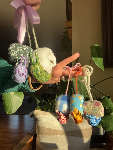 I spent multiple days crafting snails ornaments out of air clay, wire, fabric, and cheap acrylic paint after seeing an instagram reel of them. Hours have been spent collaging for no other purpose than whimsy. Experimentation. Silliness and pride.
